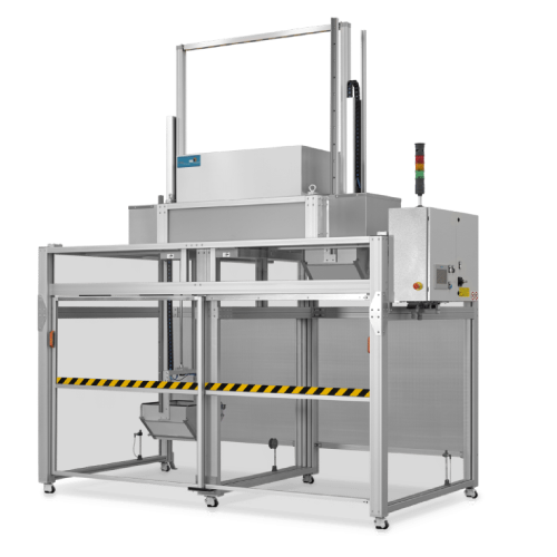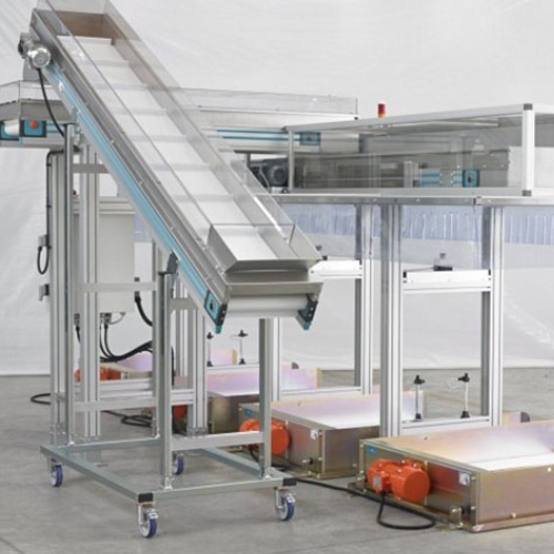 The Soft Drop system reduces the height from which the preform has to drop to a minimum. This is made possible by the utilisation of a specially designed flat conveyor used to distribute the preforms into two descending unloading hoppers which release the performs into the storage container from a minimum pre-defined height. This release height remains constant throughout the filling phase. When the container is full the conveyor changes direction to commence filling of the second container and at the same time an acoustic/visual alarm warns the operator that the already filled container should be replaced.