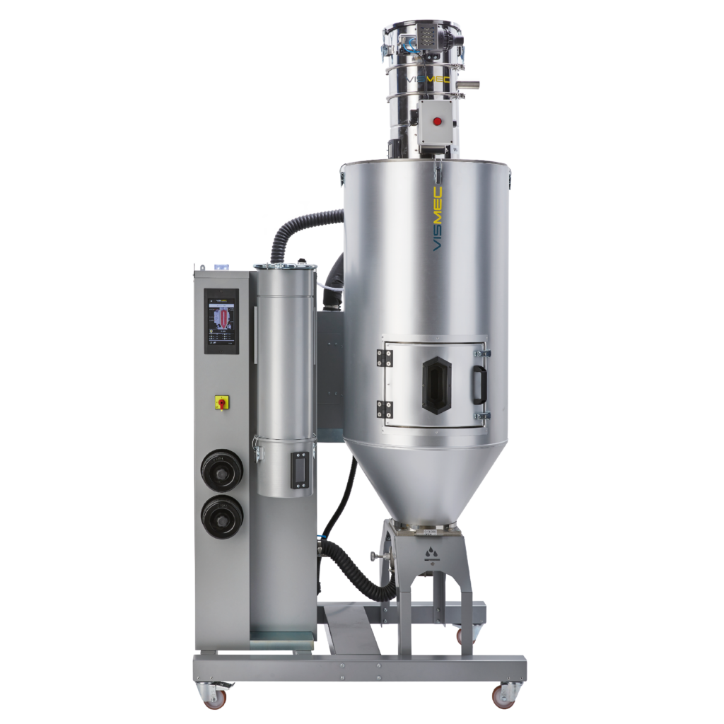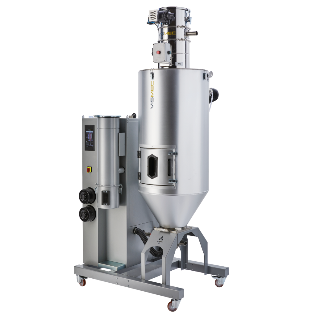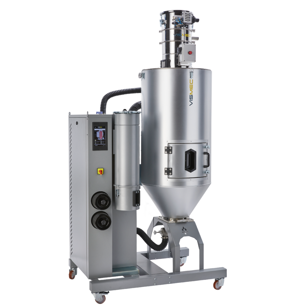 The Vismec DryCube offers a cutting-edge solution for plastics drying, combining energy efficiency, precision, and flexibility. Utilising a rotor dryer with an integrated pneumatic conveying system, the DryCube ensures that technical plastics are consistently dried and conveyed in optimal conditions. The independent processes for drying and conveying hot materials in a closed loop maintain the stability of polymers, unaffected by external temperature and humidity variations. This advanced design also allows automatic parameter settings, continuously monitoring and adjusting operations to provide the best possible drying conditions while preventing over-drying.