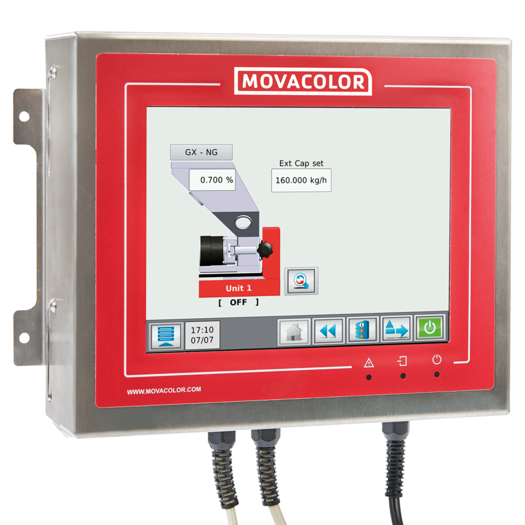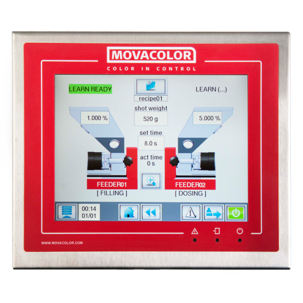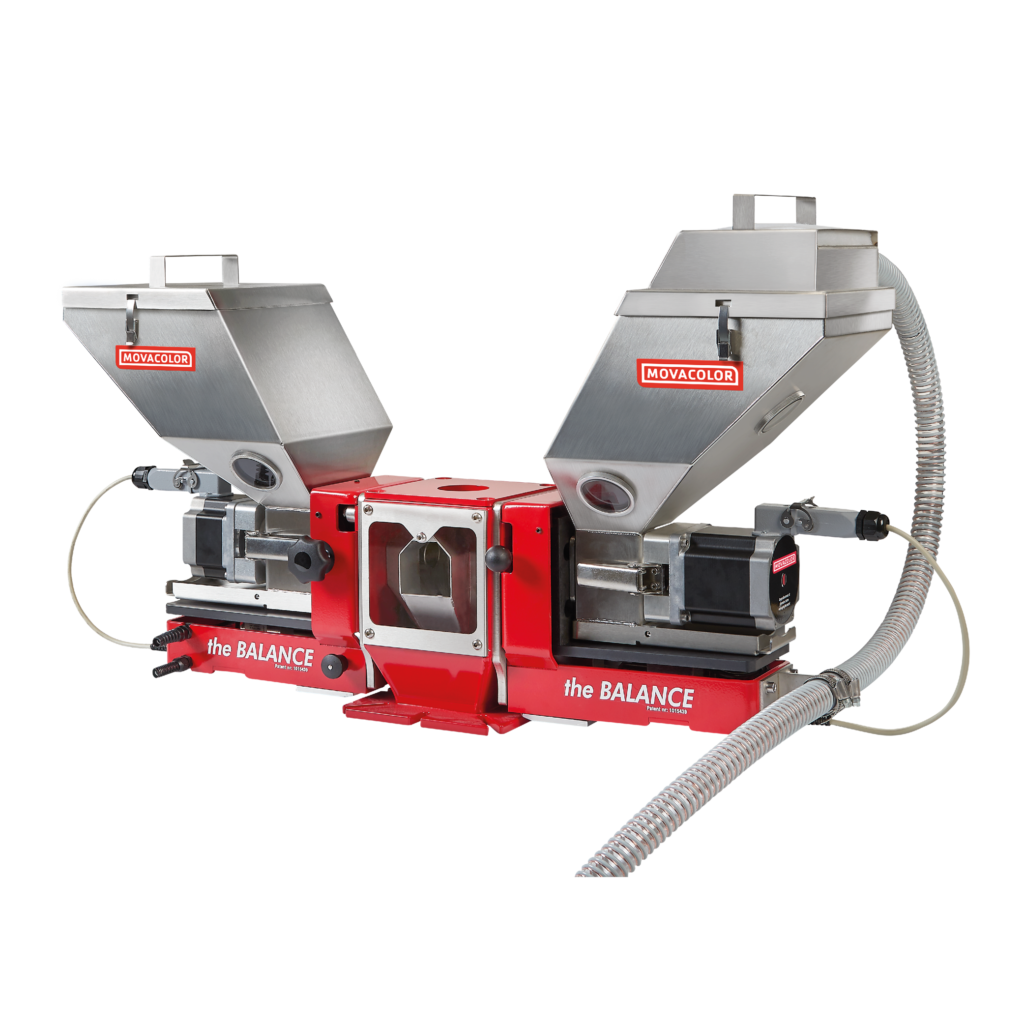 One dosing unit of the MCS Regrind (formerly MC Twin) from Movacolor functions as the main unit and doses regrind, while the second operates in conjunction with the main unit and doses the additive. In practice, this means that the more regrind available, the less colourant is added, enabling you to avoid over-consumption of additives and to reuse the maximum of regrind.
