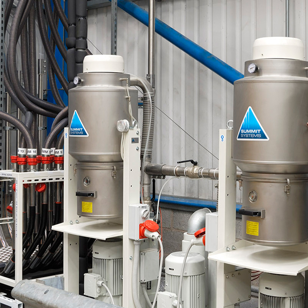 Summit Systems offers a wide range of vacuum systems using single, double and three stage side channel blowers and claw pumps for high distance and throughput applications. Speed control functions automatically adjust the conveyance speed preventing the deterioration of the polymer and resulting in energy efficiency.
