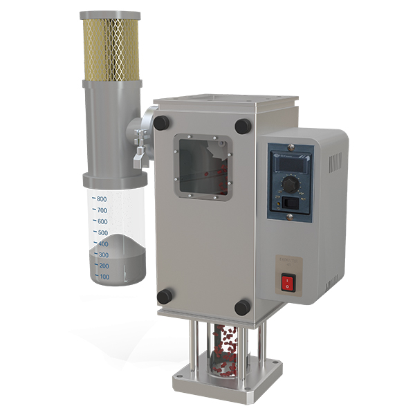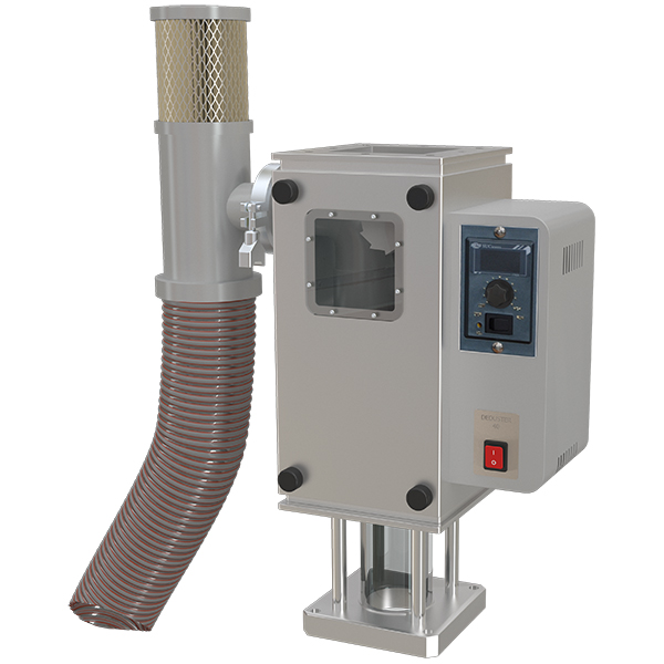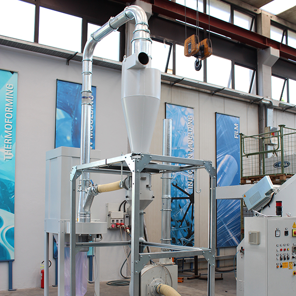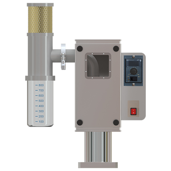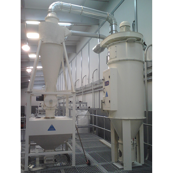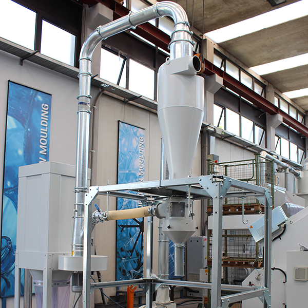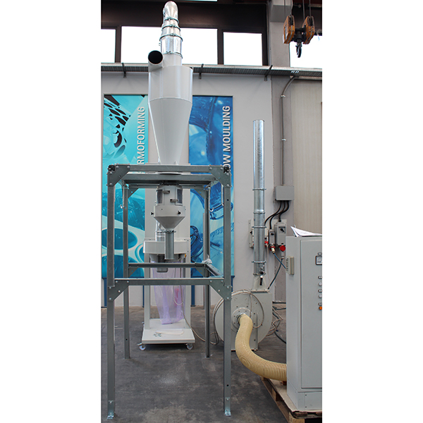 A dust separation unit designed for mounting under the material discharge cyclone for de-dusting regrind material.