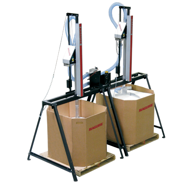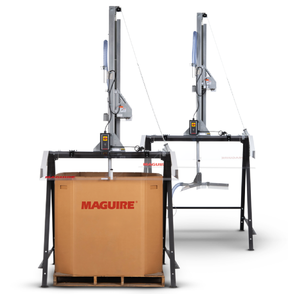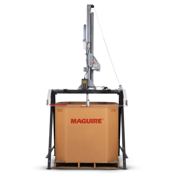 The Sweeper Unloading System from Maguire, automatically unloads material from bulk boxes. It sweeps the top level of polymer to a slotted pickup tube that vacuums pellets through a flexible suction hose. Its descending and rotational motion maintains uninterrupted action. This includes material swept into the container’s corners, with less than 4kgs of material remains in the container.