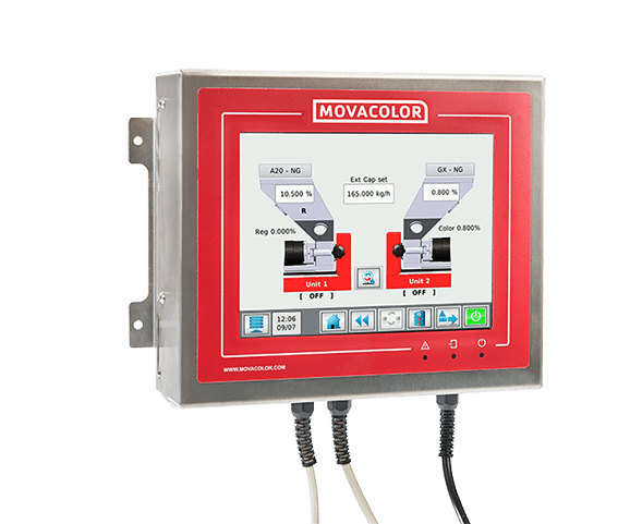 The MCTwin Gravimetric Dosing unit from Movacolor, the finest on the market, simultaneously doses additive and regrind. One dosing unit functions as the main unit and doses the regrind, while the second operates in conjunction with the main unit, dosing the additive.